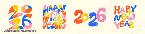 Happy New Year 2026 colorful graffiti hand lettering set, typographic compositions. Bold distorted blobs bubble rounded letters and numbers inscribed in a square shape. Modern trendy hand drawn fonts