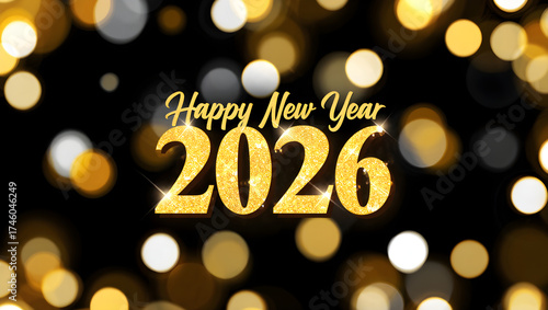 Happy New Year 2026 golden text bokeh background celebration