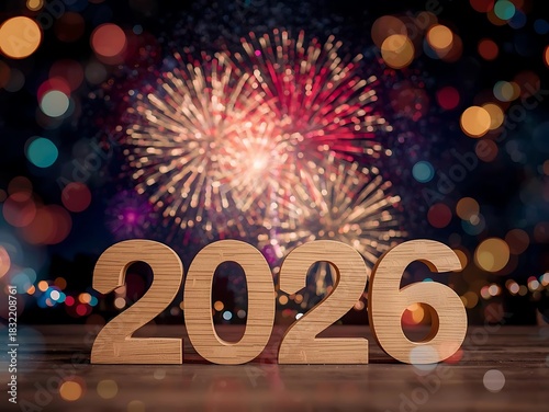 Happy new year 2026 with fireworks and bokeh lights