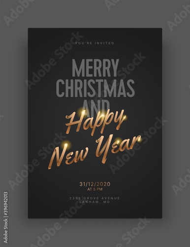 Happy New Year and Merry Christmas layout template. Vector illustration with gold lettering for flyer, banner and invitation card.