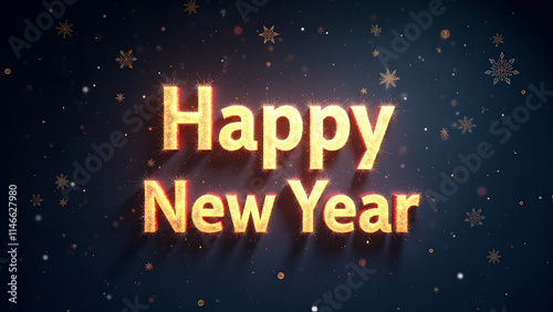 Happy New Year golden text with snowflakes. Concept of celebration and new beginnings.