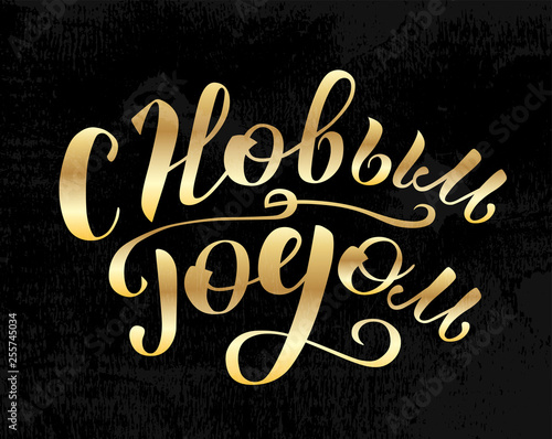 Happy new year on russian custom gold lettering text on black background, vector illustration. Winter calligraphy for logo, invitation and postcards. Christmas time vector design.