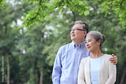 Happy old couple looking at the scenery in the park