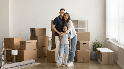 Happy parents and pretty kid girl moving into new house full length wide portrait. Young mom and dad standing together at cardboard stacked boxes, hugging, looking at camera, smiling. Banner shot