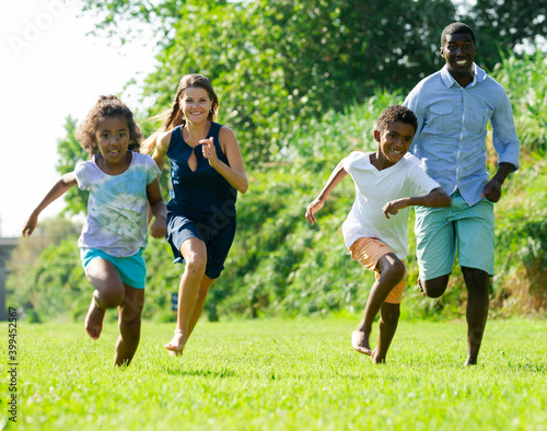 Happy preteen children with parents enjoying time together, running on green lawn in park