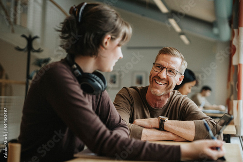 Happy professor discussing with student in library at university