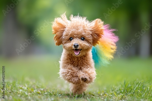 Happy Puppy Running on Grass with Colorful Tail