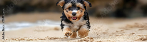 Happy puppy running on sandy beach.