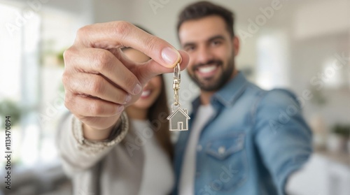 Happy real estate agent holding a house key, symbolizing property ownership, successful deals, and dreams of a new home in a modern real estate market