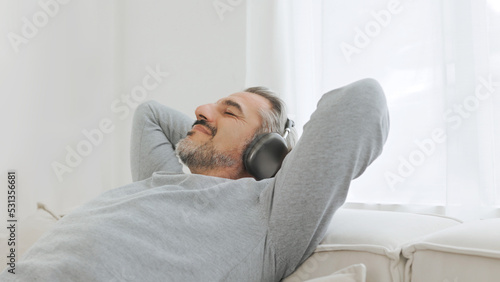 Happy relaxed Mature Adult man in headphones listening to the music and resting sitting on comfortable sofa in living room at home. Senior male sleeping on couch