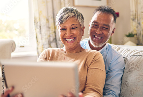 Happy, selfie and a couple with a tablet on the sofa for communication, social media or online chat. Smile, house and a senior man and woman taking a photo on technology on the couch and laughing