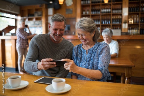 Happy senior couple looking their photos on mobile phone