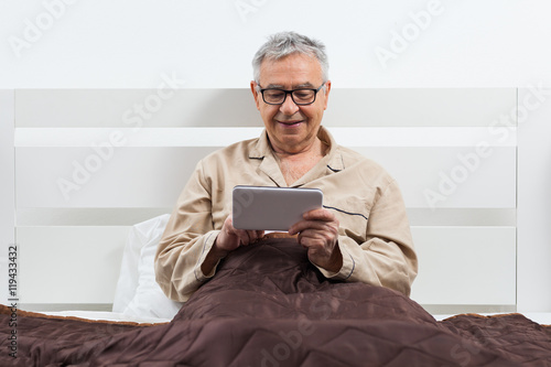 Happy senior man is lying in bed and using digital tablet.