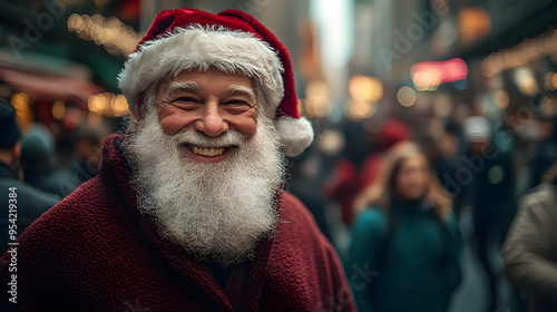 Happy senior man with white beard wearing Santa hat in city street.