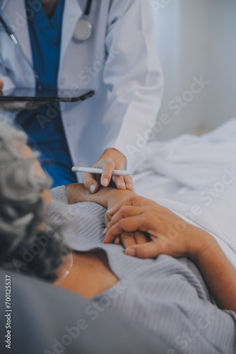 Happy senior woman visiting doctor, getting optimistic news after medical checkup, therapy. Therapist holding hand of old patient, giving hope, support, congratulating on goor treatment result