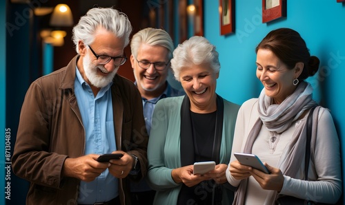 Happy seniors having fun watching funny video on smartphone against blue wall