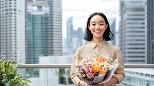 Happy single person holding a bouquet of flowers with a bright city background, ample copy space for text, high-end magazine photography, deep depth of field, Product photography with high
