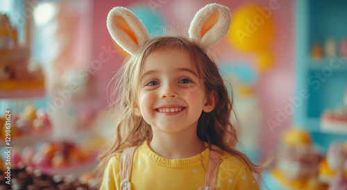 Happy smiling children with bunny ears celebrating easter day on colorful and captivating background with chocolates, bunnies and sweets