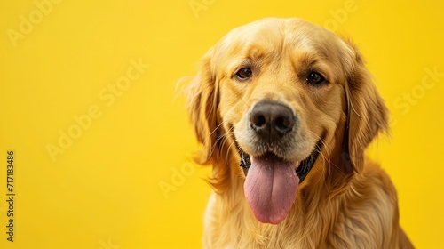 Happy smiling golden retriever dog blinking eye yellow background studio shot