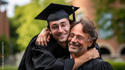 Happy smiling graduate hugs his parent after the graduation ceremony.