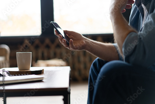 Happy smiling senior man using smartphone device while sitting on sofa at home
