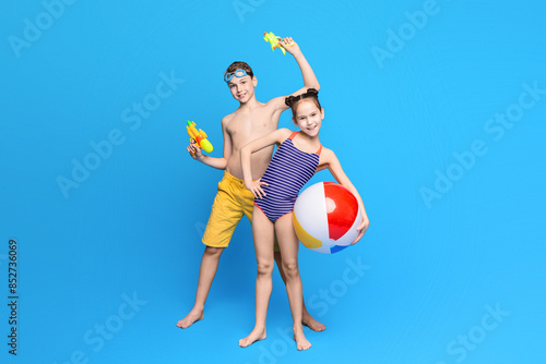 Happy summer holidays. Cheerful boy and girl playing with beach toys, blue studio background