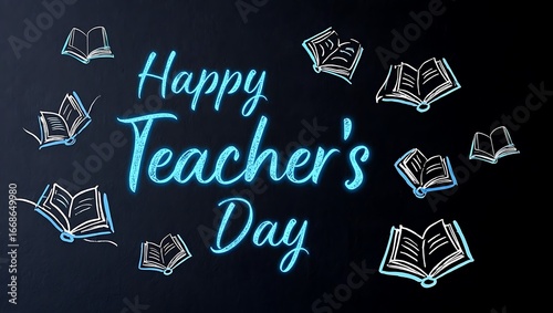 Happy Teacher's Day Chalkboard Design: Glowing Blue Text and Sketch Books.