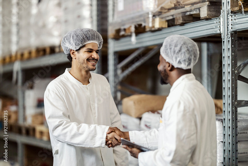 Happy two diverse business partners shaking hands at food factory's warehouse.