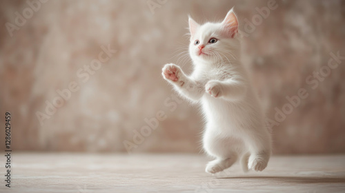 Happy white kitten jumping with funny expression. Copy space. mock up.. Banner