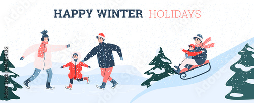 Happy winter holidays poster design with family people having fun outdoor, cartoon vector illustration. Snow activity and sport games for family with children.