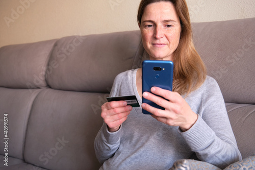 Happy woman doing shopping online sitting on couch at home. Lady insert credit card number on website with her smart phone.