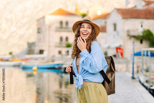 Happy woman exploring city streets. Lifestyle, travel, tourism, active life.
