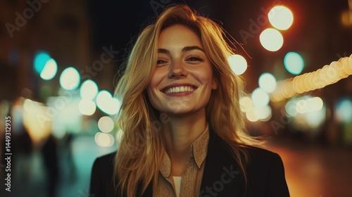 Happy woman in city lights