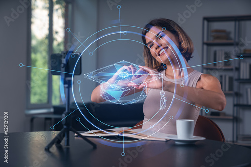 Happy woman is making video blog using smartphone on a tripod explaining with hands at office workplace. Concept of online stream, business education, conference call. Education hologram