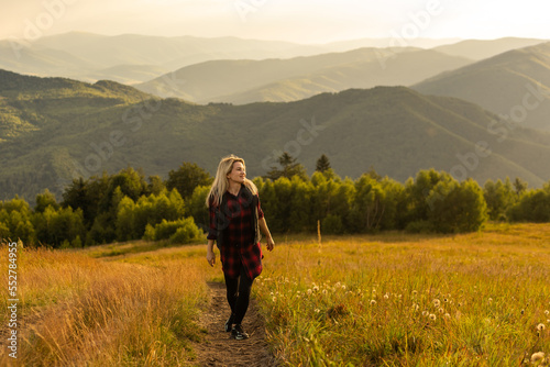 Happy woman on the sunset in nature in summer