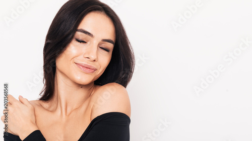 Happy woman posing in studio, smiling with eyes closed