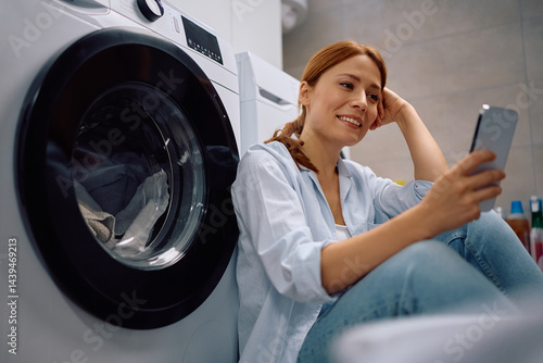 Happy woman texting on mobile phone in laundry room.