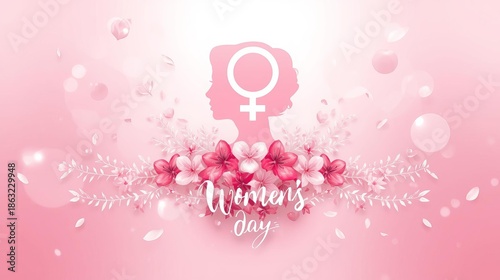 Happy women's day celebration with beautiful flowers and feminine symbol on pink background