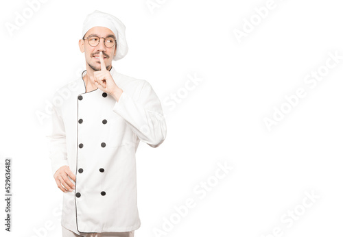 Happy young chef asking for silence gesturing with his finger
