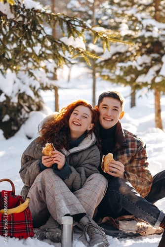 Happy young couple have a romantic picnic in the winter park. A young red-haired woman drinks tea and eats homemade cakes with her boyfriend in the middle of a snowy park.