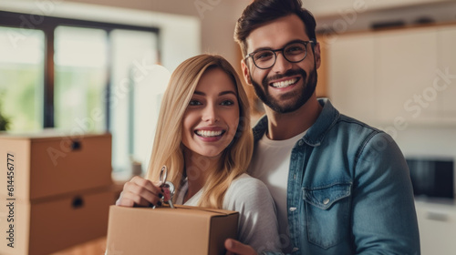 Happy young couple home owners holding keys in new home created with generative AI technology