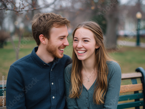 Happy young couple laughing together on park bench