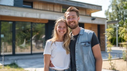 Happy young couple standing in front of a new house. Real estate and home sale concept with a happy couple. Family and relationships concept.