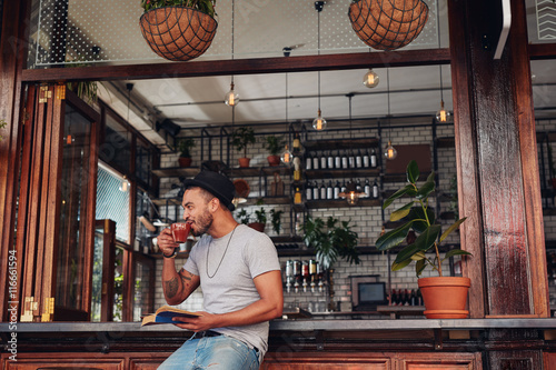 Happy young man at cafe with a book and drinking coffee
