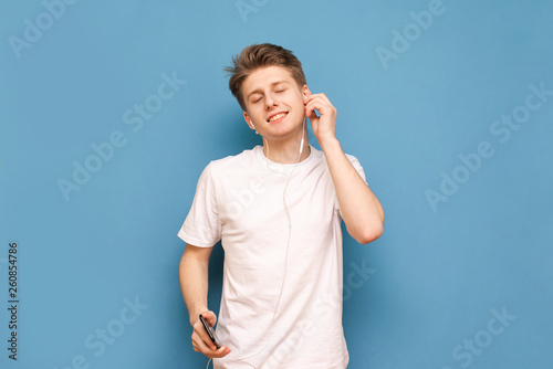 Happy young man wearing a white T-shirt enjoys music in his headphones with his eyes closed, holding a smartphone in his hands, isolated on a blue background. Copyspace