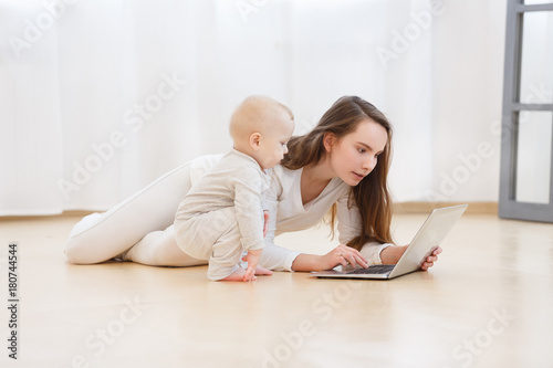 happy young mother and her little baby boy wearing white domestic clothes having fun with a laptop in the light interior at home. training of children on the laptop