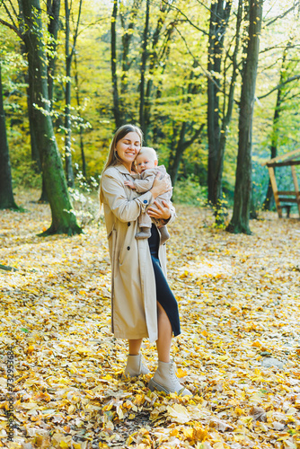 Happy young mother hug her little son in the sun on a warm spring or summer day in the park. The sun shines light in an apple orchard or in a park. Mother and son family concept in nature