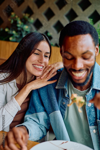 Happy young multiracial couple laughing and bonding during a romantic meal, sharing a special moment together