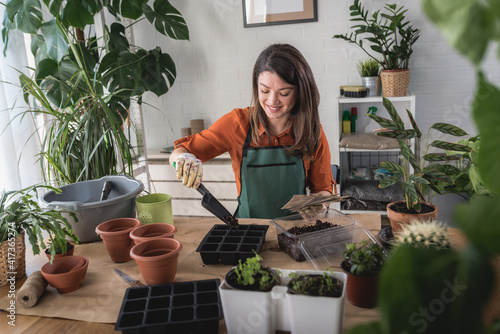 Happy young woman enjoys time at her home garden filling seed trays with potting soil. Seed-starting plants in the winter and early spring.