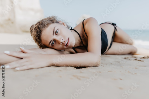 Happy young woman lying on white sand and looking at camera. Portrait of beautiful woman lying on front at tropical beach. Brunette girl lying on sand in black swimsuit relaxing at sea.